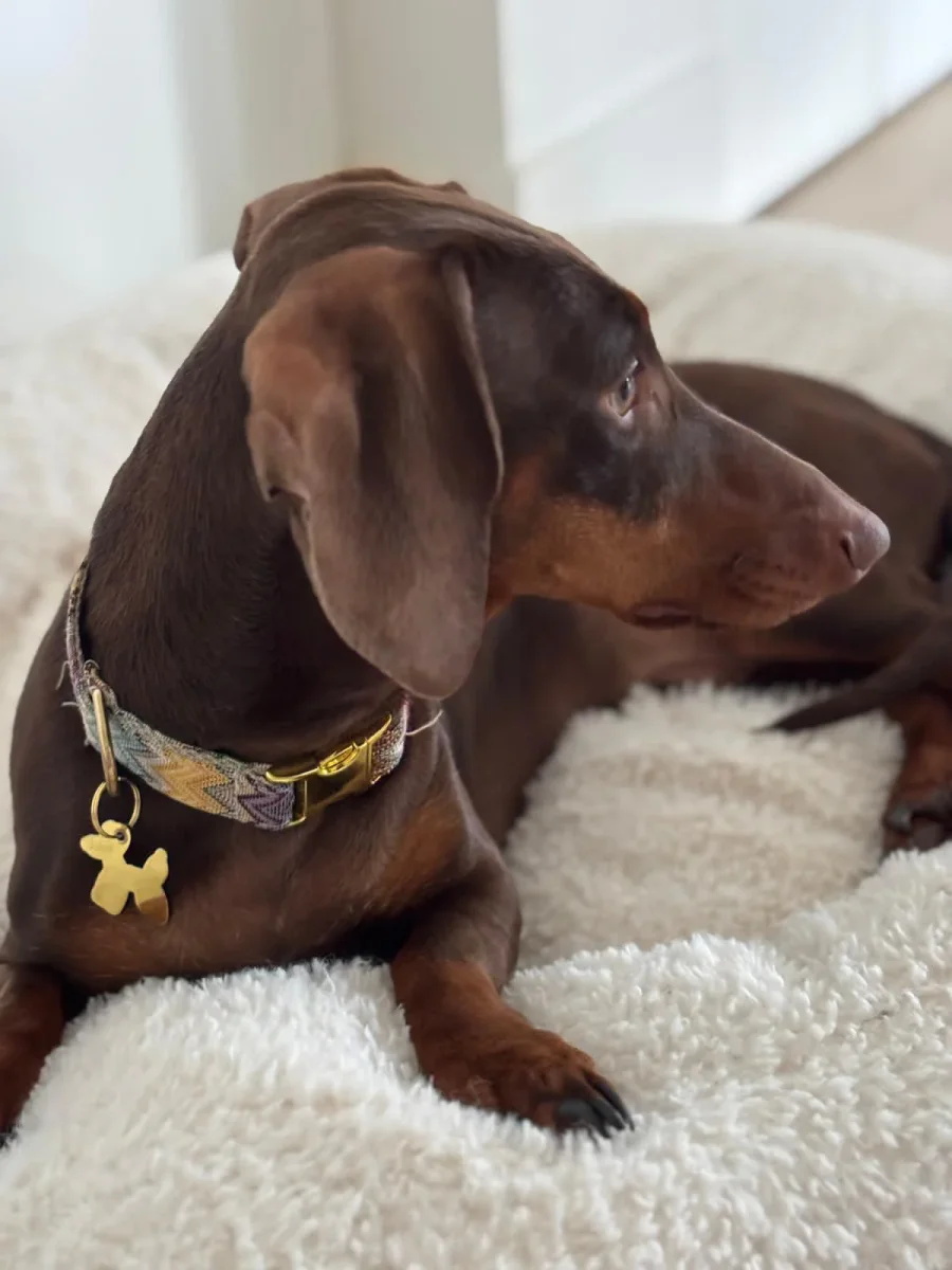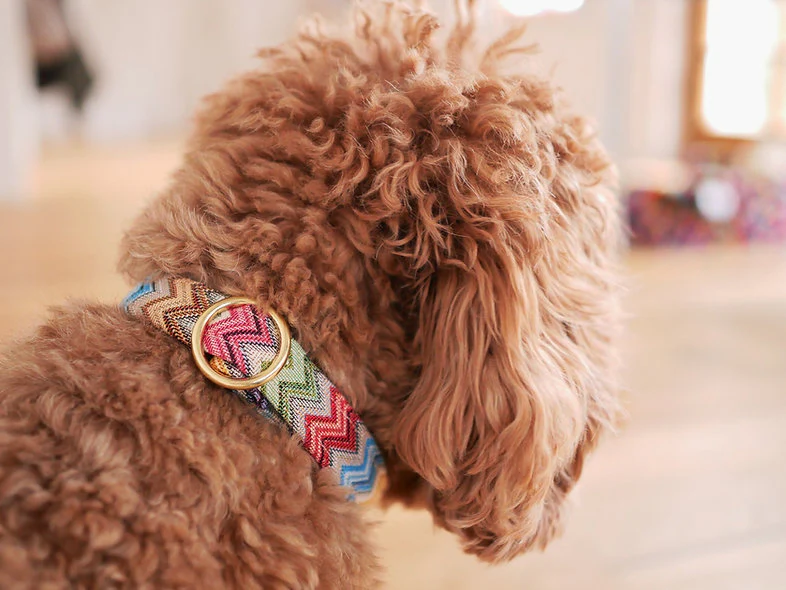 Op een dag, terwijl Sophie door de nieuwste collecties aan het bladeren was in haar favoriete honden boetiek, stuitte ze op een halsband die haar aandacht trok. Het was een collectie hondenaccessoires geïnspireerd op de iconische patronen: levendige kleuren en ingewikkelde zigzaglijnen die op betoverende wijze over de stoffen dansten.