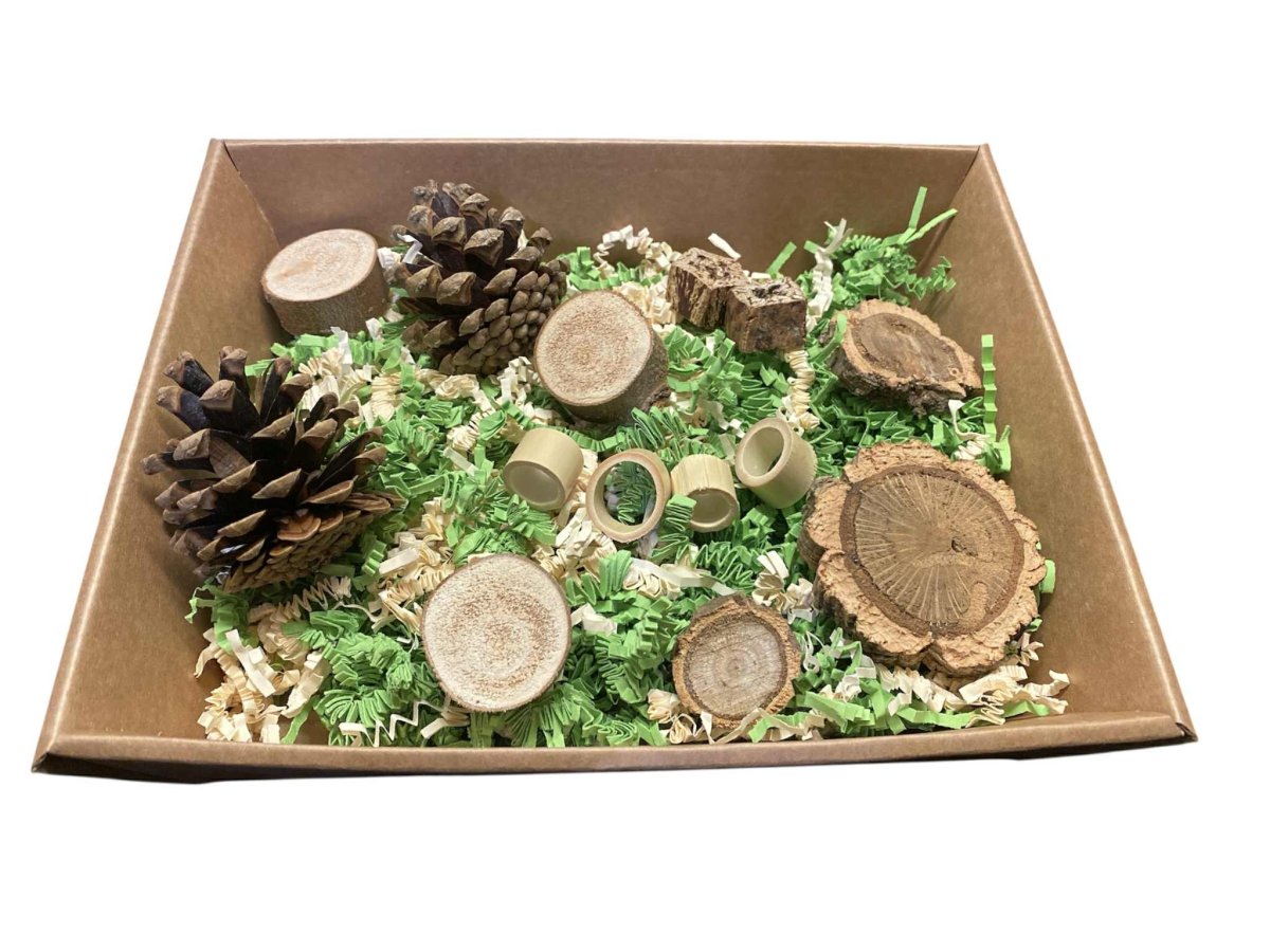 Deze foerageerbox brengt het bos naar jouw vogel. Met natuurlijke materialen zoals dennenappels, kurk en bamboe worden parkieten en papegaaien uitgedaagd om te knagen, slopen en foerageren. Zo stimuleer je natuurlijk gedrag én voorkom je verveling.