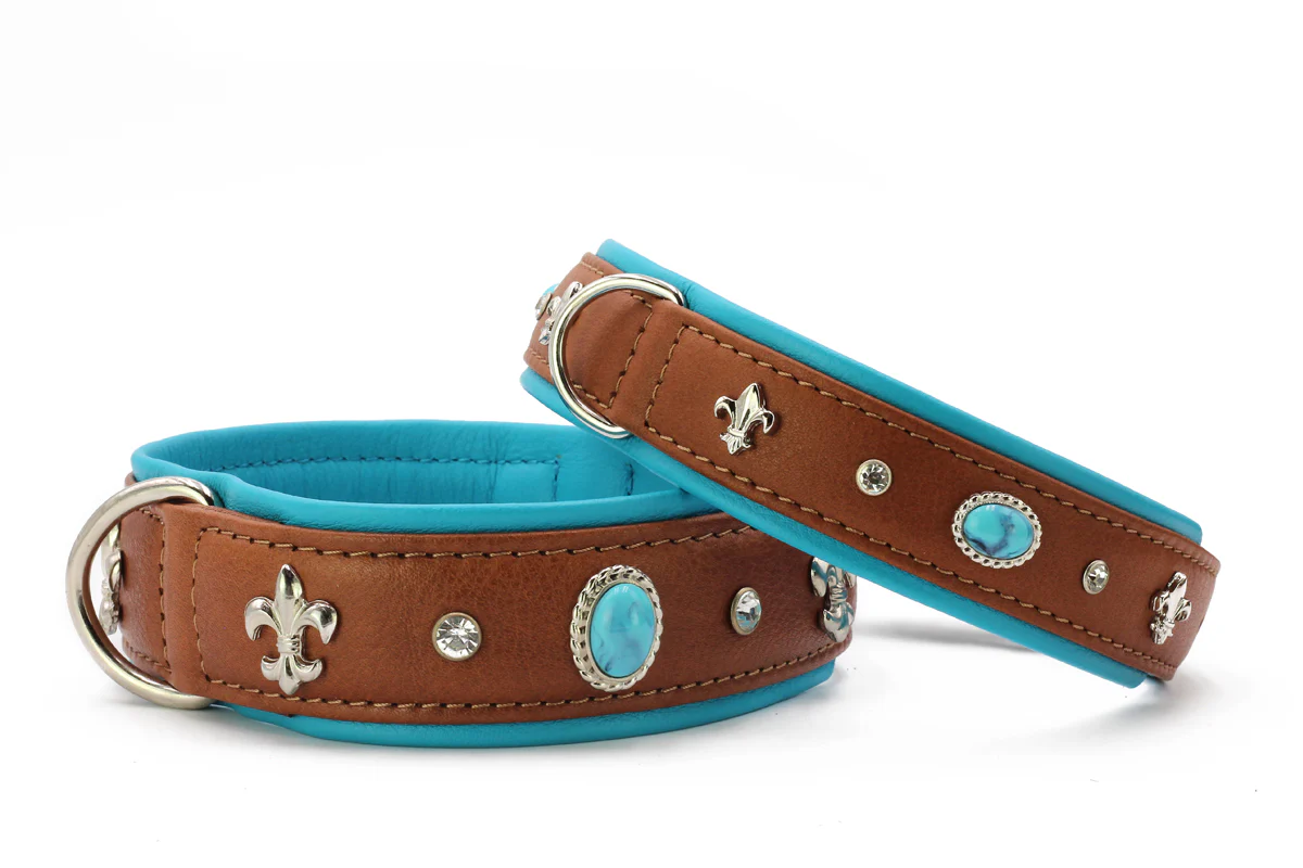 Mooie lederen halsband met studs en steentjes afgewerkt met gouden details.